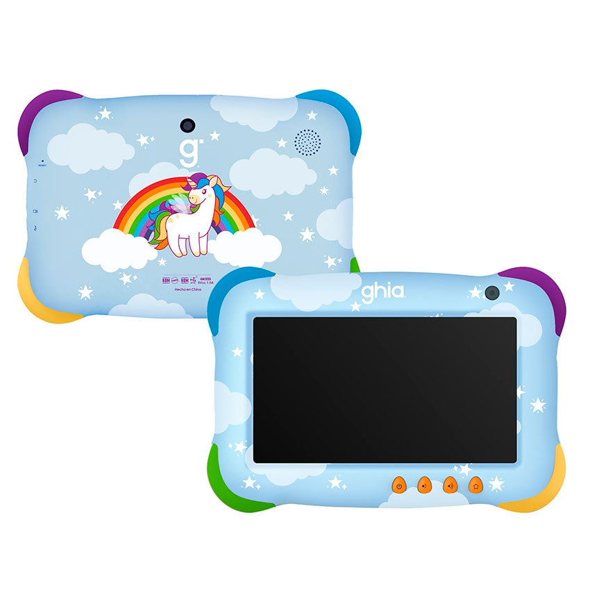 - La Tablet Infantil GHIA -Unicornio es ideal para que los pequeños de casa aprendan y se diviertan de forma segura. Su diseño en color azul con estampado de unicornio, nubes, estrellas y arcoíris la convierte en una opción atractiva para niñas y niños.